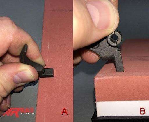 Trigger: Start by sanding the in the longitudinal direction ( the direction of travel of the hammer ) on both top and front faces. Use a flat surface and hold the faces as square as possible. You only want to remove the stock grind marks and smooth surface out. Then work both surfaces the same with a fine diamond grit file or stone. This will create an almost razor sharp edge of the sear point. Take the file or stone and LIGHTLY rub it along the knife edge a couple times just to break the dead sharp corner. The faces should start to look shiny and almost reflective. Be sure to watch the video as this process explains much better visually than in written form. Repeat the process of the diamond file or stone on the hammer sear point. Reassemble your trigger and oil it well with your favorite gun lube.